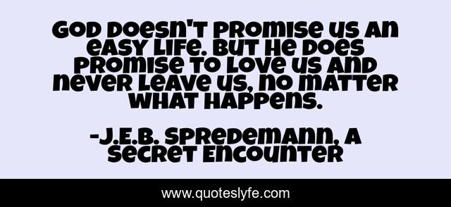 This page presents the quote "God doesn't promise us an easy life. But He does promise to love us and never leave us, no matter what happens.". Author of this quote is J.E.B. Spredemann, A Secret Encounter. This quote is about love, loneliness, comfort, alone, easy-life, god-s-love, affection,.