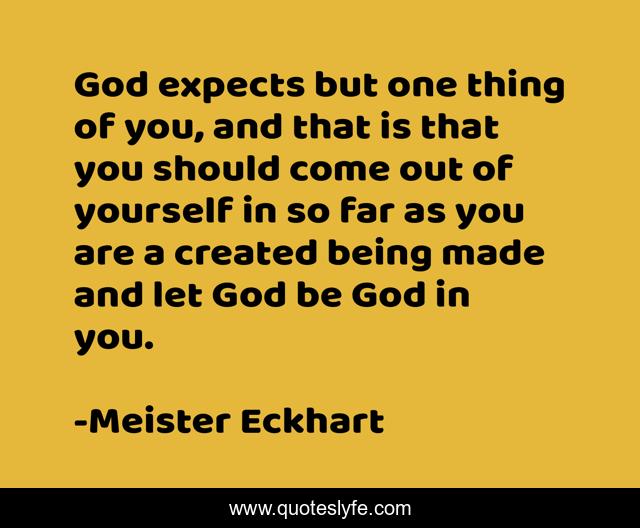 This page presents the quote "God expects but one thing of you, and that is that you should come out of yourself in so far as you are a created being made and let God be God in you.". Author of this quote is Meister Eckhart. This quote is about being, yourself,.