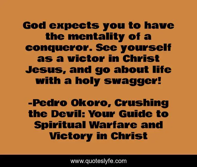 This page presents the quote "God expects you to have the mentality of a conqueror. See yourself as a victor in Christ Jesus, and go about life with a holy swagger!". Author of this quote is Pedro Okoro, Crushing the Devil: Your Guide to Spiritual Warfare and Victory in Christ. This quote is about spiritual-growth, spiritual-development, spirituality, inspirational, enthusiasm,.
