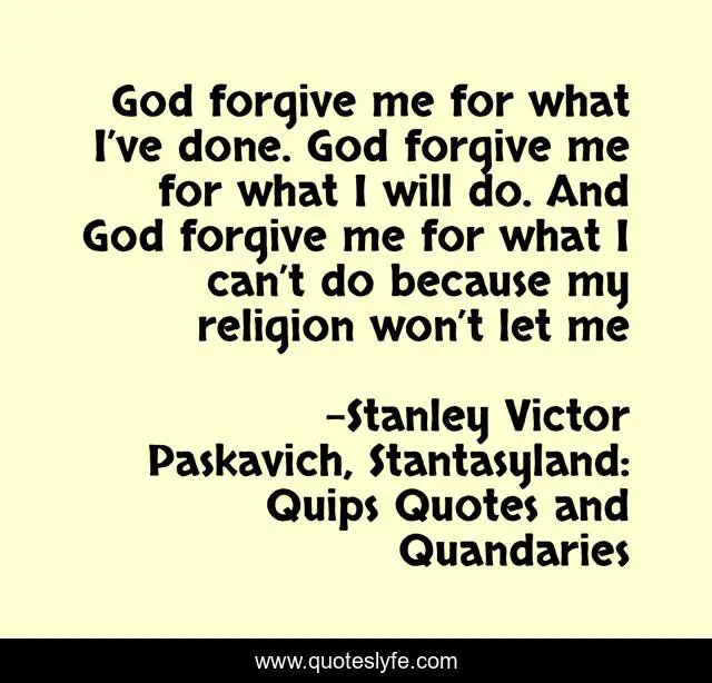 This page presents the quote "God forgive me for what I’ve done. God forgive me for what I will do. And God forgive me for what I can’t do because my religion won’t let me". Author of this quote is Stanley Victor Paskavich, Stantasyland: Quips Quotes and Quandaries. This quote is about life, belief, religion, god, spirituality, church, sin,.