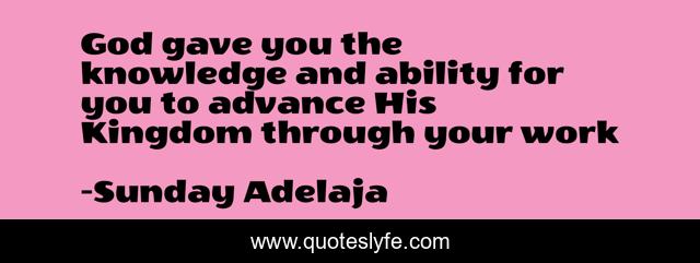 This page presents the quote "God gave you the knowledge and ability for you to advance His Kingdom through your work". Author of this quote is Sunday Adelaja. This quote is about ability, god, work, advancement, kingdom-of-god, knowledge,.