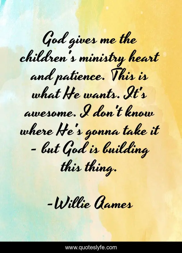 This page presents the quote "God gives me the children's ministry heart and patience. This is what He wants. It's awesome. I don't know where He's gonna take it - but God is building this thing.". Author of this quote is Willie Aames. This quote is about god, children, heart,.