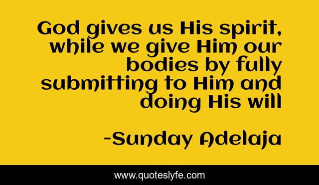 This page presents the quote "God gives us His spirit, while we give Him our bodies by fully submitting to Him and doing His will". Author of this quote is Sunday Adelaja. This quote is about god, transformation, submitting, spirit, bodies, gives,.