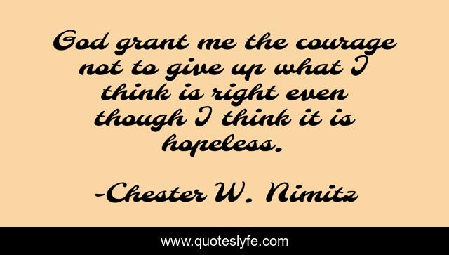 This page presents the quote "God grant me the courage not to give up what I think is right even though I think it is hopeless.". Author of this quote is Chester W. Nimitz. This quote is about me, god, courage,.