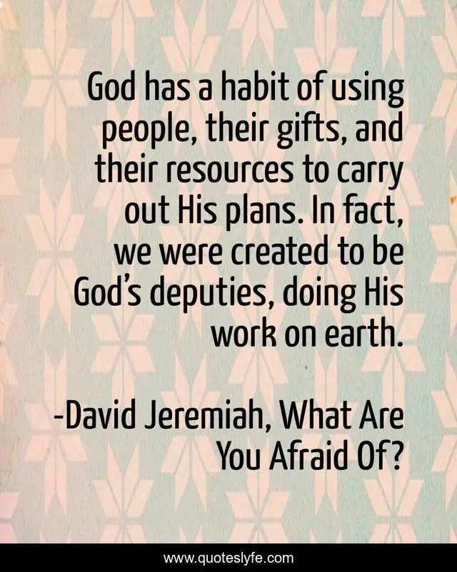 This page presents the quote "God has a habit of using people, their gifts, and their resources to carry out His plans. In fact, we were created to be God’s deputies, doing His work on earth.". Author of this quote is David Jeremiah, What Are You Afraid Of?. This quote is about gifts, god, work, plans, christianity,.