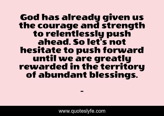 This page presents the quote "God has already given us the courage and strength to relentlessly push ahead. So let's not hesitate to push forward until we are greatly rewarded in the territory of abundant blessings.". Author of this quote is . This quote is about edmond-mbiaka, god, territory-of-abundant, push-forward, abundant-blessings,.