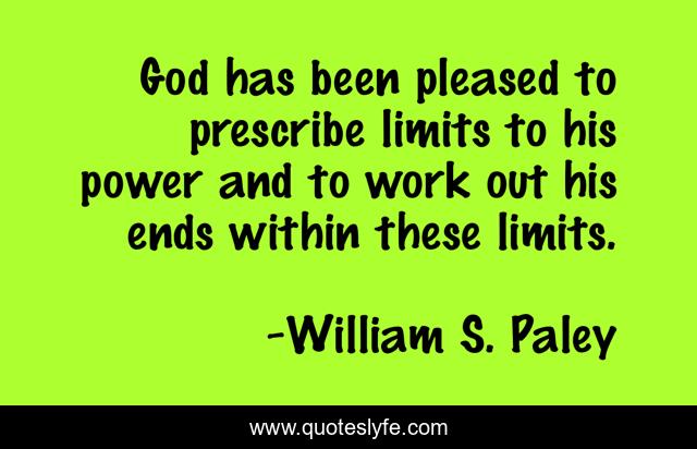 This page presents the quote "God has been pleased to prescribe limits to his power and to work out his ends within these limits.". Author of this quote is William S. Paley. This quote is about god, work, limits,.