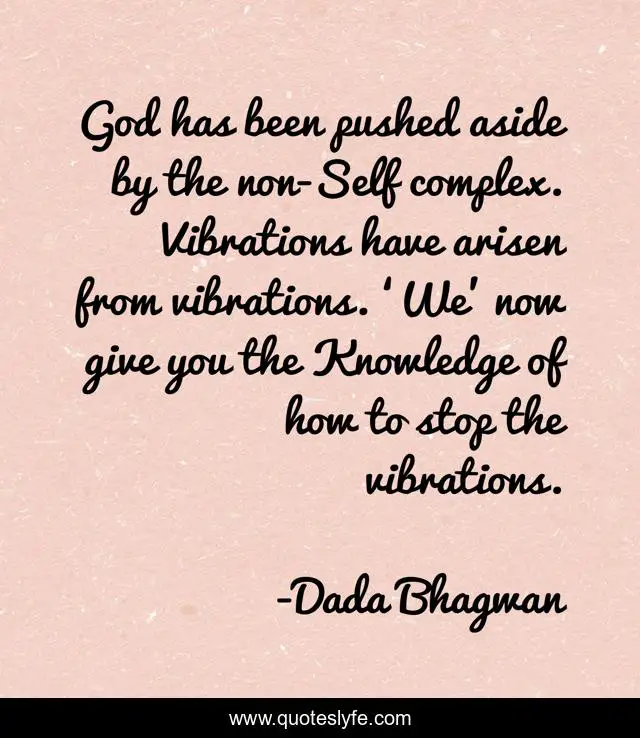 This page presents the quote "God has been pushed aside by the non-Self complex. Vibrations have arisen from vibrations. ‘We’ now give you the Knowledge of how to stop the vibrations.". Author of this quote is Dada Bhagwan. This quote is about spiritual, knowledge, god, self, soul, knowledge-of-the-self, self-realization,.