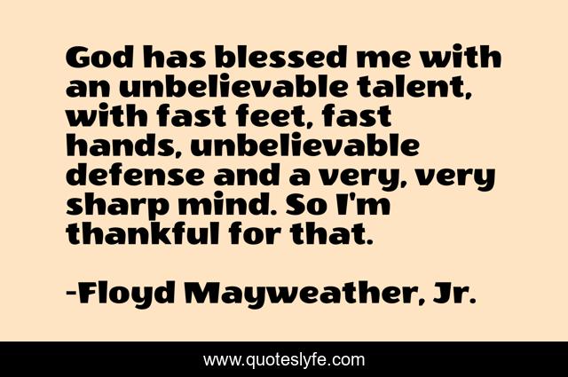 This page presents the quote "God has blessed me with an unbelievable talent, with fast feet, fast hands, unbelievable defense and a very, very sharp mind. So I'm thankful for that.". Author of this quote is Floyd Mayweather, Jr.. This quote is about god, mind, blessed,.