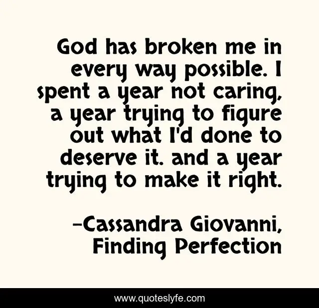 This page presents the quote "God has broken me in every way possible. I spent a year not caring, a year trying to figure out what I'd done to deserve it. and a year trying to make it right.". Author of this quote is Cassandra Giovanni, Finding Perfection. This quote is about alchohol, beautifully-flawed-series, dealing-with-grief, mourning, dealing-with-it, guilt, remorse,.