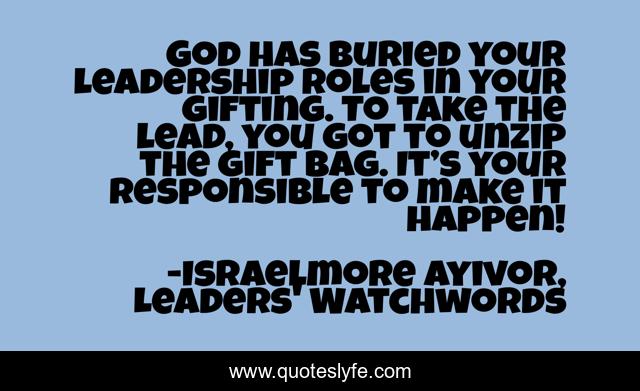 This page presents the quote "God has buried your leadership roles in your gifting. To take the lead, you got to unzip the gift bag. It’s your responsible to make it happen!". Author of this quote is Israelmore Ayivor, Leaders' Watchwords. This quote is about food-for-thought, unzip, leaders, lead, gifting, responsible, gifts, leadership-roles, talents,.