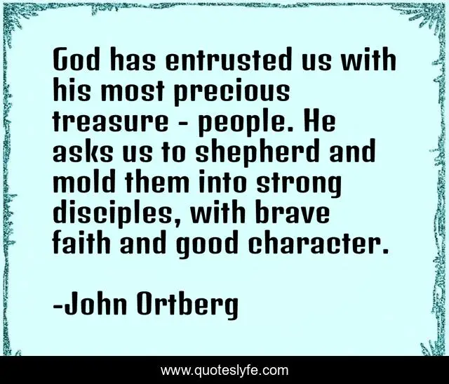 This page presents the quote "God has entrusted us with his most precious treasure - people. He asks us to shepherd and mold them into strong disciples, with brave faith and good character.". Author of this quote is John Ortberg. This quote is about god, good, character,.