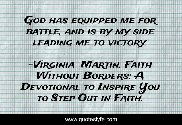 This page presents the quote "God has equipped me for battle, and is by my side leading me to victory.". Author of this quote is Virginia Martin, Faith Without Borders: A Devotional to Inspire You to Step Out in Faith.. This quote is about enthusiasm, spiritual, inspirational, devotional,.