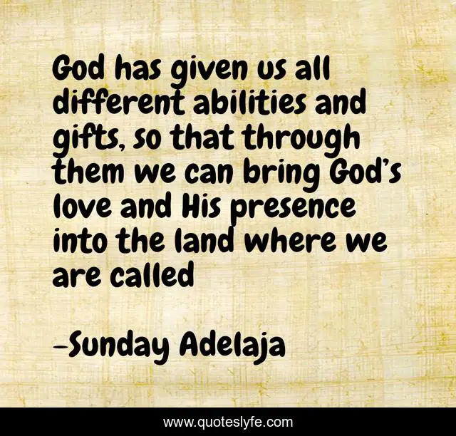 This page presents the quote "God has given us all different abilities and gifts, so that through them we can bring God’s love and His presence into the land where we are called". Author of this quote is Sunday Adelaja. This quote is about land, ability, presence, god, god-s-love, gifts, called,.