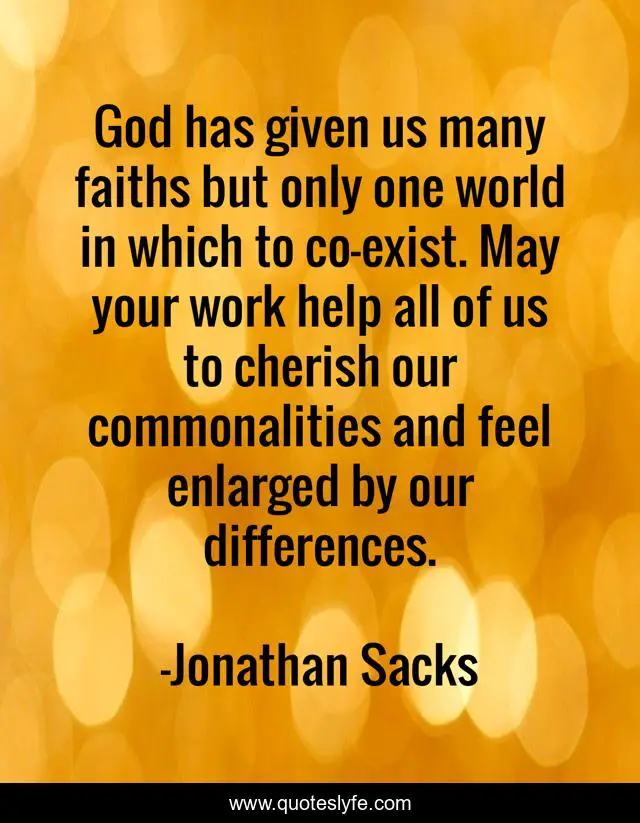 This page presents the quote "God has given us many faiths but only one world in which to co-exist. May your work help all of us to cherish our commonalities and feel enlarged by our differences.". Author of this quote is Jonathan Sacks. This quote is about enthusiasm, tolerance, coexistence, inspirational,.