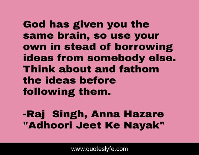 This page presents the quote "God has given you the same brain, so use your own in stead of borrowing ideas from somebody else. Think about and fathom the ideas before following them.". Author of this quote is Raj Singh, Anna Hazare "Adhoori Jeet Ke Nayak". .