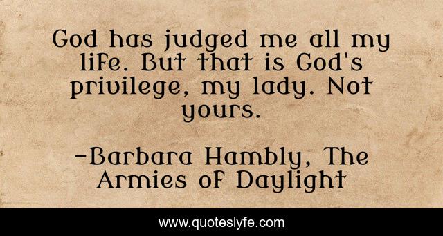 This page presents the quote "God has judged me all my life. But that is God's privilege, my lady. Not yours.". Author of this quote is Barbara Hambly, The Armies of Daylight. This quote is about religion, judgment,.