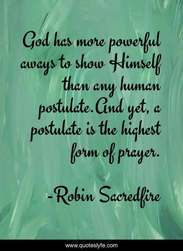 This page presents the quote "God has more powerful aways to show Himself than any human postulate.And yet, a postulate is the highest form of prayer.". Author of this quote is Robin Sacredfire. This quote is about miracles, postulates, prayer,.