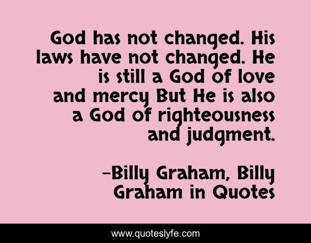 This page presents the quote "God has not changed. His laws have not changed. He is still a God of love and mercy But He is also a God of righteousness and judgment.". Author of this quote is Billy Graham, Billy Graham in Quotes. This quote is about love, affection, billy-graham,.
