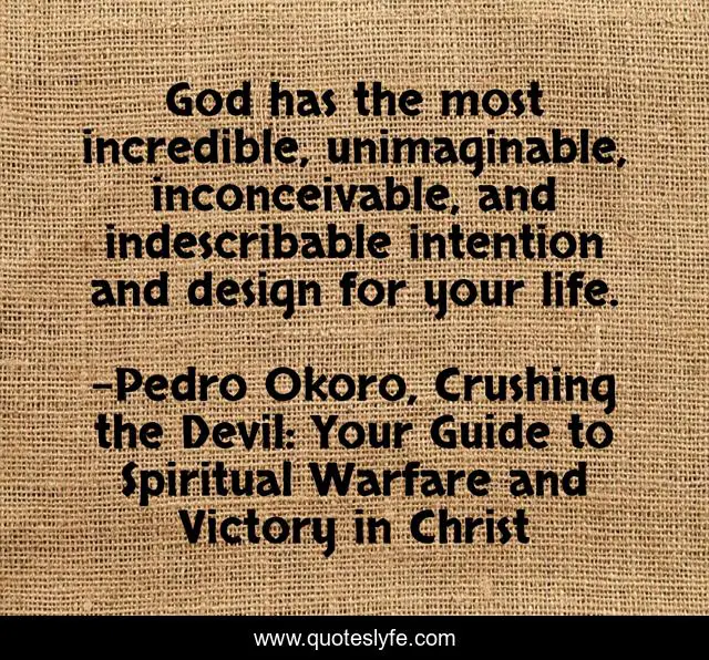 This page presents the quote "God has the most incredible, unimaginable, inconceivable, and indescribable intention and design for your life.". Author of this quote is Pedro Okoro, Crushing the Devil: Your Guide to Spiritual Warfare and Victory in Christ. This quote is about spiritual-growth, inspirational, enthusiasm,.