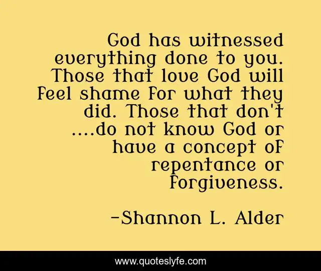 This page presents the quote "God has witnessed everything done to you. Those that love God will feel shame for what they did. Those that don't ....do not know God or have a concept of repentance or forgiveness.". Author of this quote is Shannon L. Alder. This quote is about repentance, forgiveness, shameful,.