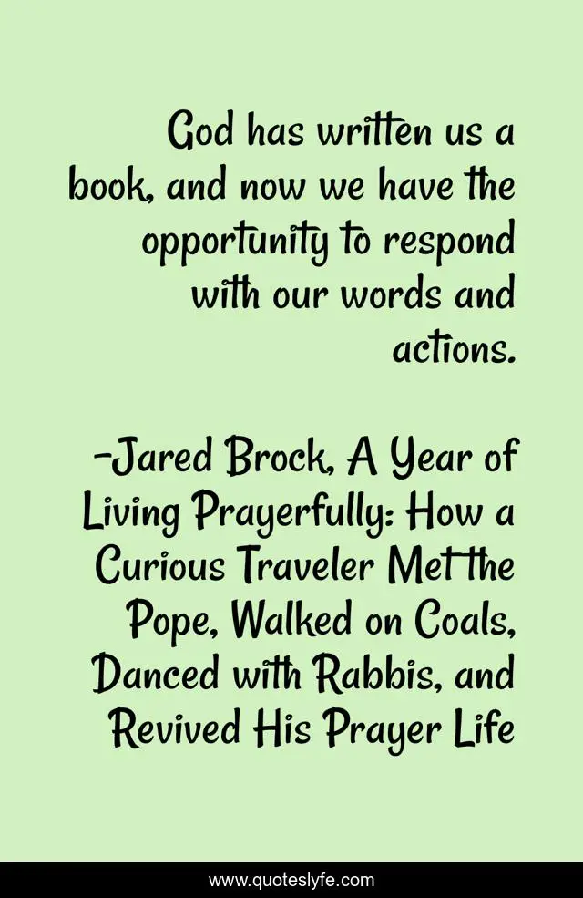 "Jared Brock, A Year of Living Prayerfully: How a Curious Traveler Met the Pope, Walked on Coals, Danced with Rabbis, and Revived His Prayer Life Quotes." Quoteslyfe.com, 2025. Sun. 07 Dec. 2025. <https://www.quoteslyfe.com/quote/God-has-written-us-a-book-and-157904>.