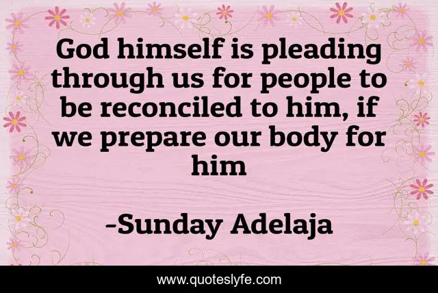 This page presents the quote "God himself is pleading through us for people to be reconciled to him, if we prepare our body for him". Author of this quote is Sunday Adelaja. This quote is about body, prepare, people, god, reconciled, pleading,.