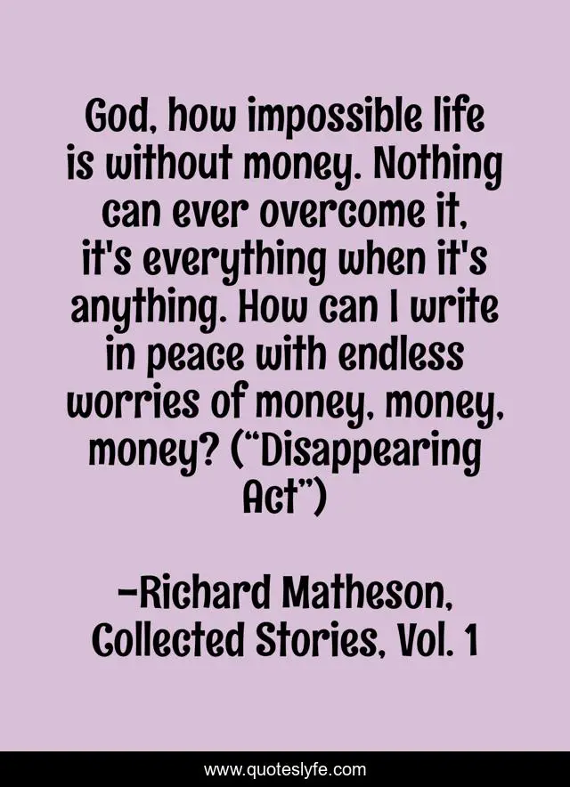"Richard Matheson, Collected Stories, Vol. 1 Quotes." Quoteslyfe.com, 2025. Sun. 07 Dec. 2025. <https://www.quoteslyfe.com/quote/God-how-impossible-life-is-without-money-27677>.