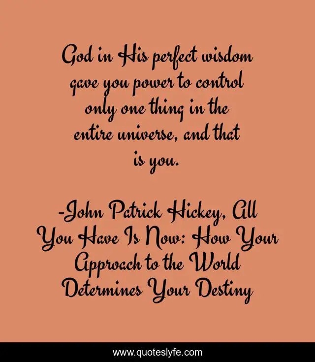 This page presents the quote "God in His perfect wisdom gave you power to control only one thing in the entire universe, and that is you.". Author of this quote is John Patrick Hickey, All You Have Is Now: How Your Approach to the World Determines Your Destiny. This quote is about success, personal-growth, action, achievement, personal-development, goal-setting, goals,.