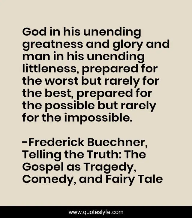 This page presents the quote "God in his unending greatness and glory and man in his unending littleness, prepared for the worst but rarely for the best, prepared for the possible but rarely for the impossible.". Author of this quote is Frederick Buechner, Telling the Truth: The Gospel as Tragedy, Comedy, and Fairy Tale. This quote is about worst-moment-know, god, possible, greatness, impossible, best,.