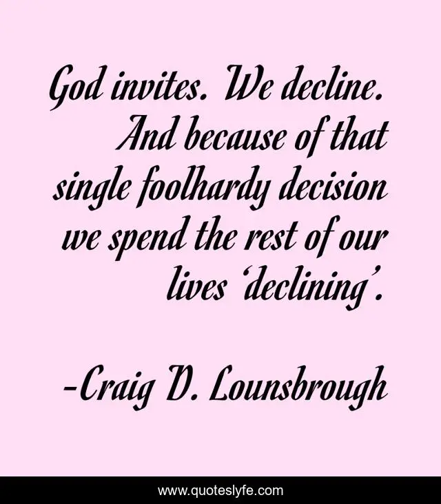 This page presents the quote "God invites. We decline. And because of that single foolhardy decision we spend the rest of our lives ‘declining’.". Author of this quote is Craig D. Lounsbrough. This quote is about fool, decline, life, christian, invite, foolhardy, god, defeat, ignorance,.
