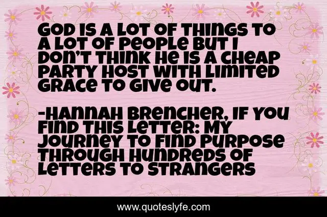 This page presents the quote "God is a lot of things to a lot of people but I don’t think he is a cheap party host with limited grace to give out.". Author of this quote is Hannah Brencher, If You Find This Letter: My Journey to Find Purpose Through Hundreds of Letters to Strangers. This quote is about god, grace, hope,.