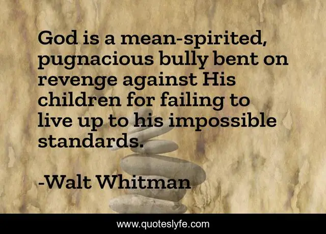 This page presents the quote "God is a mean-spirited, pugnacious bully bent on revenge against His children for failing to live up to his impossible standards.". Author of this quote is Walt Whitman. This quote is about bully, revenge, standards, pugnacious, children, mean,.
