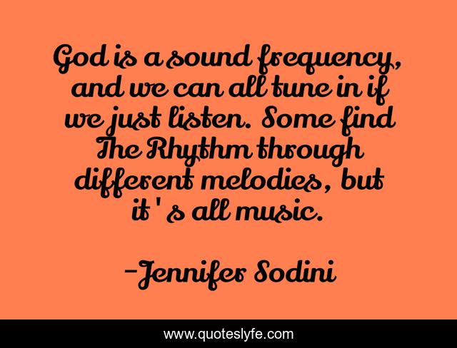 This page presents the quote "God is a sound frequency, and we can all tune in if we just listen. Some find The Rhythm through different melodies, but it's all music.". Author of this quote is Jennifer Sodini. This quote is about spiritual, heaven, inspirational, consciousness, spiritual-teachings, consciousness-raising, god, philosophy, esoteric,.