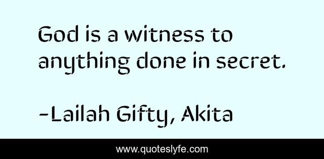 This page presents the quote "God is a witness to anything done in secret.". Author of this quote is Lailah Gifty, Akita. This quote is about wise-words, hidden-motives, god, deeds, intentions, secrets, witness,.
