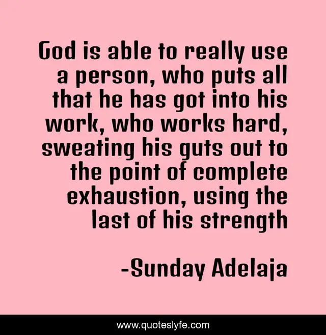 This page presents the quote "God is able to really use a person, who puts all that he has got into his work, who works hard, sweating his guts out to the point of complete exhaustion, using the last of his strength". Author of this quote is Sunday Adelaja. .
