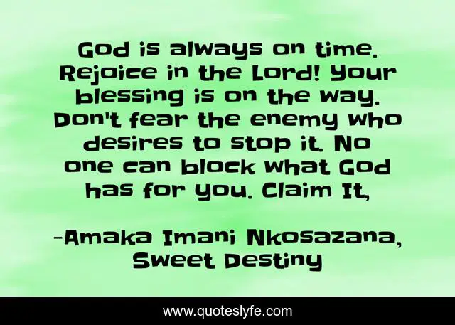 "Amaka Imani Nkosazana, Sweet Destiny Quotes." Quoteslyfe.com, 2025. Fri. 05 Dec. 2025. <https://www.quoteslyfe.com/quote/God-is-always-on-time-Rejoice-in-97309>.