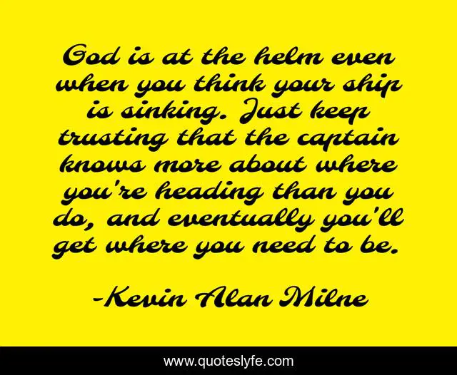 This page presents the quote "God is at the helm even when you think your ship is sinking. Just keep trusting that the captain knows more about where you're heading than you do, and eventually you'll get where you need to be.". Author of this quote is Kevin Alan Milne. This quote is about sweet-misfortune, novel,.