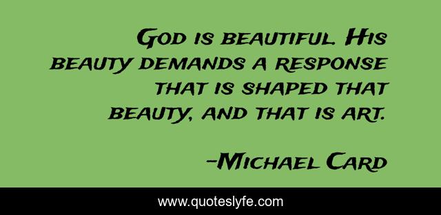 This page presents the quote "God is beautiful. His beauty demands a response that is shaped that beauty, and that is art.". Author of this quote is Michael Card. This quote is about beauty-of-god, art, worship,.