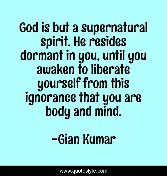 This page presents the quote "God is but a supernatural spirit. He resides dormant in you, until you awaken to liberate yourself from this ignorance that you are body and mind.". Author of this quote is Gian Kumar. This quote is about god, supernatural,.
