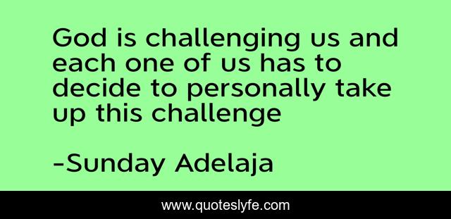 This page presents the quote "God is challenging us and each one of us has to decide to personally take up this challenge". Author of this quote is Sunday Adelaja. This quote is about challenging, wealth-prosperity, money, challenge, riches, decide, personally,.