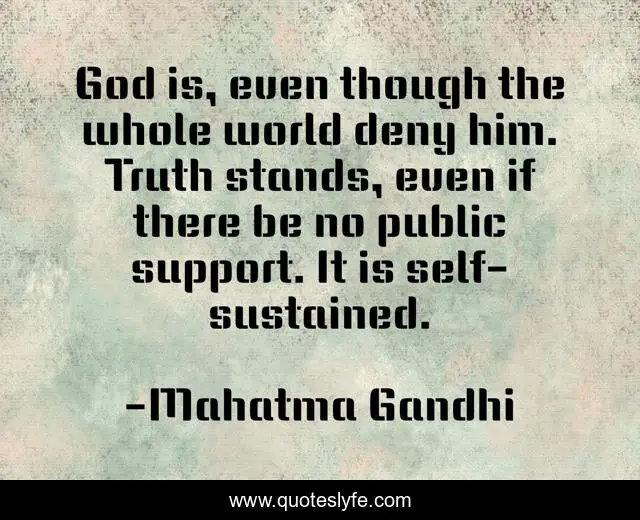 This page presents the quote "God is, even though the whole world deny him. Truth stands, even if there be no public support. It is self-sustained.". Author of this quote is Mahatma Gandhi. This quote is about world, support, truth,.