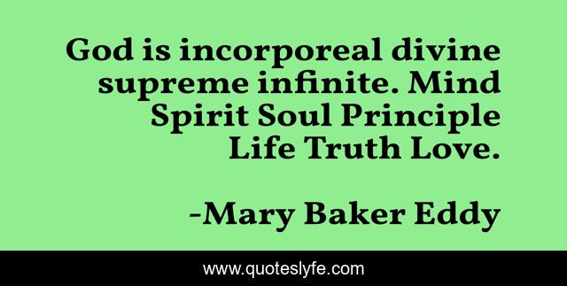 This page presents the quote "God is incorporeal divine supreme infinite. Mind Spirit Soul Principle Life Truth Love.". Author of this quote is Mary Baker Eddy. .