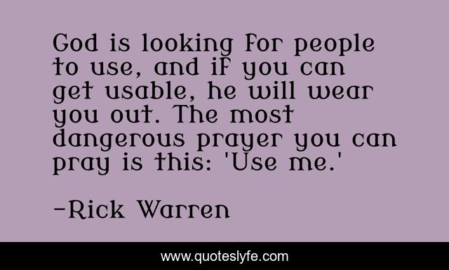 This page presents the quote "God is looking for people to use, and if you can get usable, he will wear you out. The most dangerous prayer you can pray is this: 'Use me.'". Author of this quote is Rick Warren. This quote is about me, prayer, people,.