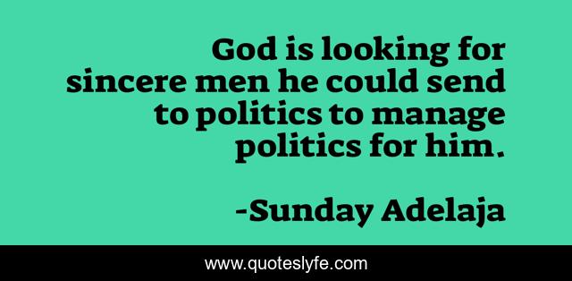 This page presents the quote "God is looking for sincere men he could send to politics to manage politics for him.". Author of this quote is Sunday Adelaja. This quote is about god, sincere, men, politics,.