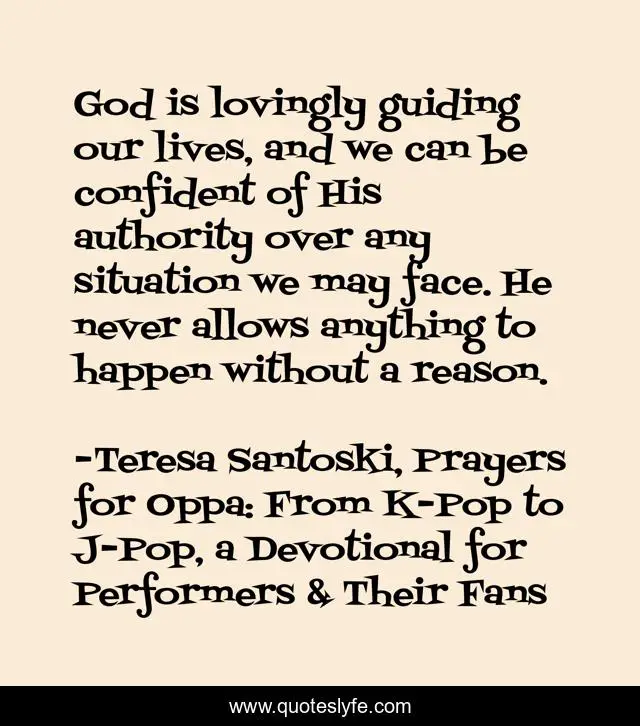 This page presents the quote "God is lovingly guiding our lives, and we can be confident of His authority over any situation we may face. He never allows anything to happen without a reason.". Author of this quote is Teresa Santoski, Prayers for Oppa: From K-Pop to J-Pop, a Devotional for Performers & Their Fans. This quote is about god, christian, christian-living, god-s-sovereignty,.