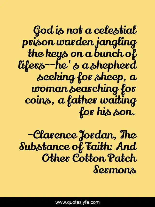 This page presents the quote "God is not a celestial prison warden jangling the keys on a bunch of lifers--he's a shepherd seeking for sheep, a woman searching for coins, a father waiting for his son.". Author of this quote is Clarence Jordan, The Substance of Faith: And Other Cotton Patch Sermons. This quote is about religion, philosophy, christianity,.