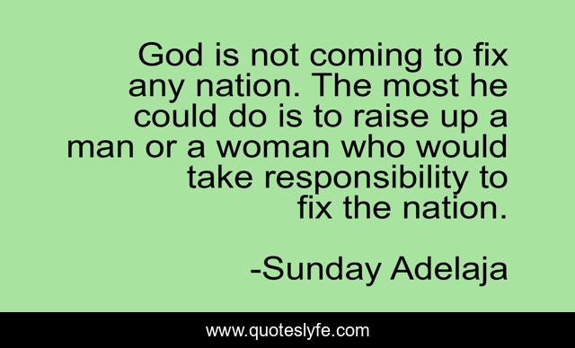 This page presents the quote "God is not coming to fix any nation. The most he could do is to raise up a man or a woman who would take responsibility to fix the nation.". Author of this quote is Sunday Adelaja. This quote is about woman, god, fix, responsible, nations, man,.