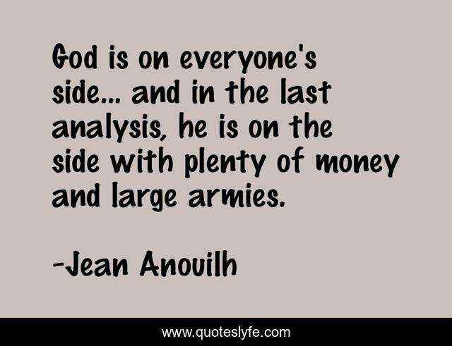 This page presents the quote "God is on everyone's side... and in the last analysis, he is on the side with plenty of money and large armies.". Author of this quote is Jean Anouilh. This quote is about god, everyone, plenty,.