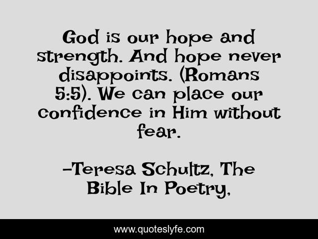 This page presents the quote "God is our hope and strength. And hope never disappoints. (Romans 5:5). We can place our confidence in Him without fear.". Author of this quote is Teresa Schultz, The Bible In Poetry,. This quote is about confidence, strength, god, disappointment, fear, hope,.